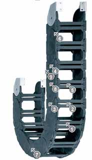 Here the e-chain® is used with the upper run gliding on the lower run. We recommend letting our engineers support you when planning this type of system. In case of travel lengths between 12m and 15m, we recommend a larger unsupported e-chain®.