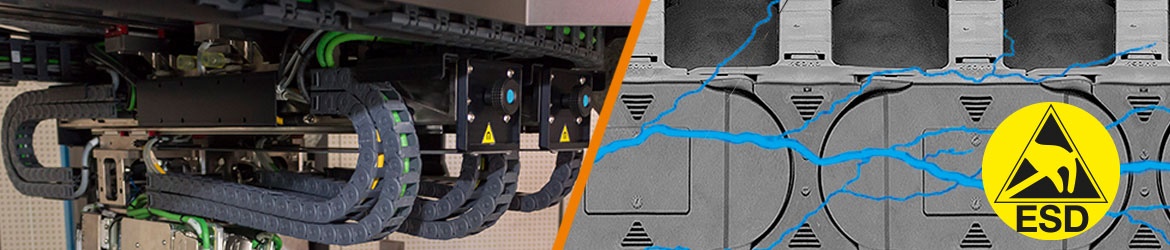 Energy chains made of conductive ESD material are used to avoid static charge in manufacturing processes for electronic components or assemblies. Measurements of the electrical surface leakage resistance for igus energy chains with the special material igumid GC, were made back in 1992 by igus GmbH together with the PTB (Physikalisch-Technische-Bundesanstalt) in Braunschweig, supplemented by additional certifications in 1998 and 1999 according to DIN 53482, and the guidelines for static electricity ZH1/200 of the Federation of Trade Associations.