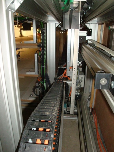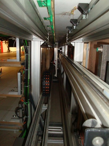 The so-called "catapult takeoff and landing" is provided by installing two counter-running E2/000 e-chains® of the Series 255, which is integrated in a super aluminum trough with a dampening profile. The reason for the use of the energy chain was its small pitch, whereby only a very low polygon effect was achieved when unrolling in the radius. An additional objective was a very low-noise application, without the e-chains® making noise in operation, for which the dampening profile was additionally used in the guide channel.