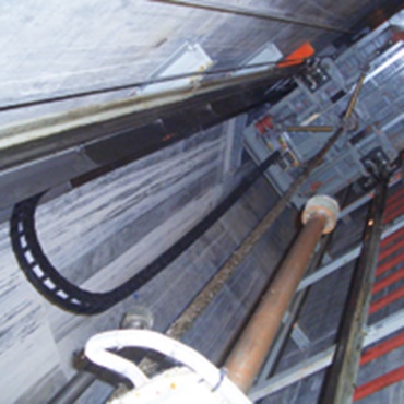 On a 28 m travel with a narrow installation space of only 200 mm, the series 2500 e-chain® braves external influences such as rain and much wind in continuous operation 24 hours all 365 days.
