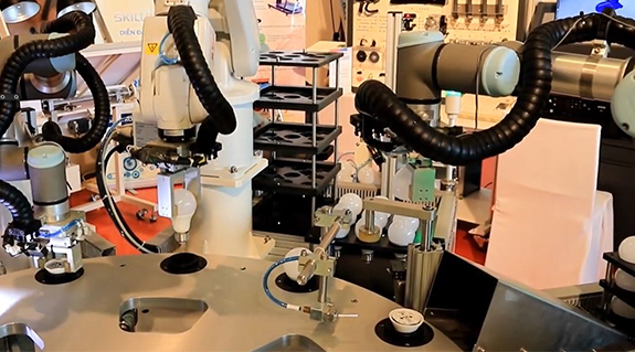 The TRE.40.058.0.B in combination with UR metal clamps ensure trouble-free cable guidance on the cobot for LED bulb production in confined spaces