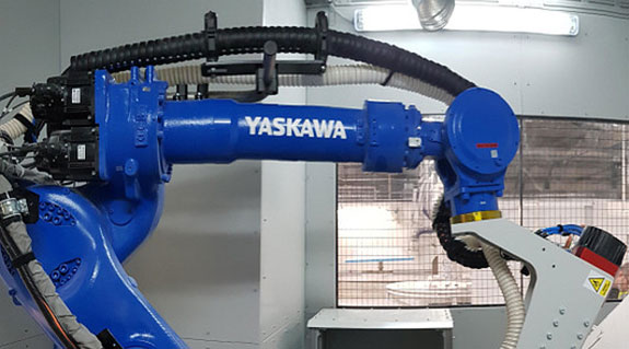 Deburring shower trays with a fibre-rod on a Yaskawa