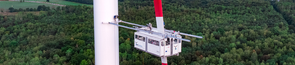 The system operates with three tensioned cables from the housing, which are controlled by winches, and a support on the tower. This makes the platform vertically mobile. It can be moved horizontally over a distance of up to 15 metres . And the maintenance chamber can even follow the rotation of the rotor blade from the base to the tip. In addition, the platform can be enlarged in the working position by extending so-called "balconies".