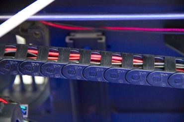drylin® N flat guides and drylin® SD lead screw units perform the height adjustments. As a black anodised profile, drylin® N ideally blends into the design of the 3D printer. The e-chain system® E045 reliably guides all connection cables in any direction of travel. drylin® R round guides guide the print head in the other directions in parallel.