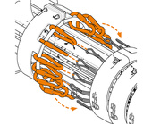The e-loop combines the advantages of a plastic energy chain with those of a high-strength pull rope. Inside the chain, the pull rope transfers the pull forces to the mounting brackets and the structure. As a result, the cables are kept completely relieved of strain.