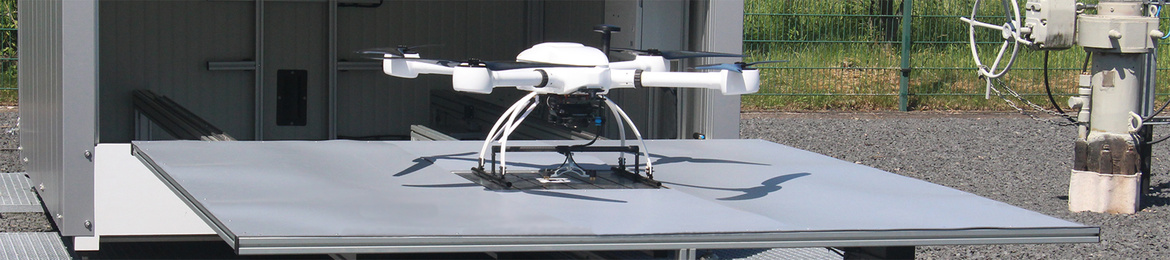 Drone on an extending platform The launch and landing platform is also a charging station. The quadrocopter uses contacts on its feet to recharge its batteries. Its range is 18 kilometres.