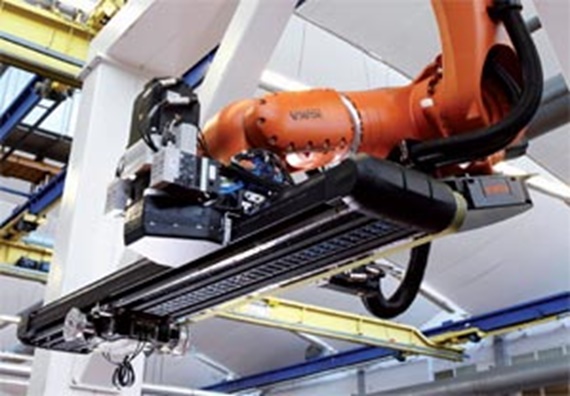 The plant engineers KUKA Systems develop concepts to connect presses and rely on the KUKA Cobra for this. There is an additional axis mounted on the robot arm which loads and unloads the presses. This innovation makes it possible to increase output and reduce the distance between presses, and combines the dynamism of a linear axis with the flexibility of a robot in a quite unique way. For this application, igus® has developed a new chain guide variant of the standard E6 chain with new connectors in order to make the KUKA Cobra design as compact as possible.