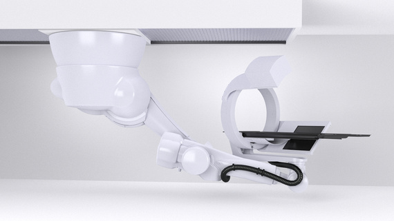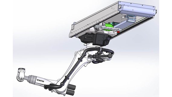 This patient positioning and imaging system is used in the radiotherapy. It consists of a linear axis mounted to the ceiling, a robot, optimized for radiotherapie and an X-ray unit, mounted on a patient couch. The guiding of numerous cables and conduits is hindered by a limited ceiling height and the compact covering of the positioning system. The building height could be reduced without losing functionality by using an e-chain® of the series 3400 from igus®. A triflex® R chain guides the cables at rotaional movements perfectly and without torsion.